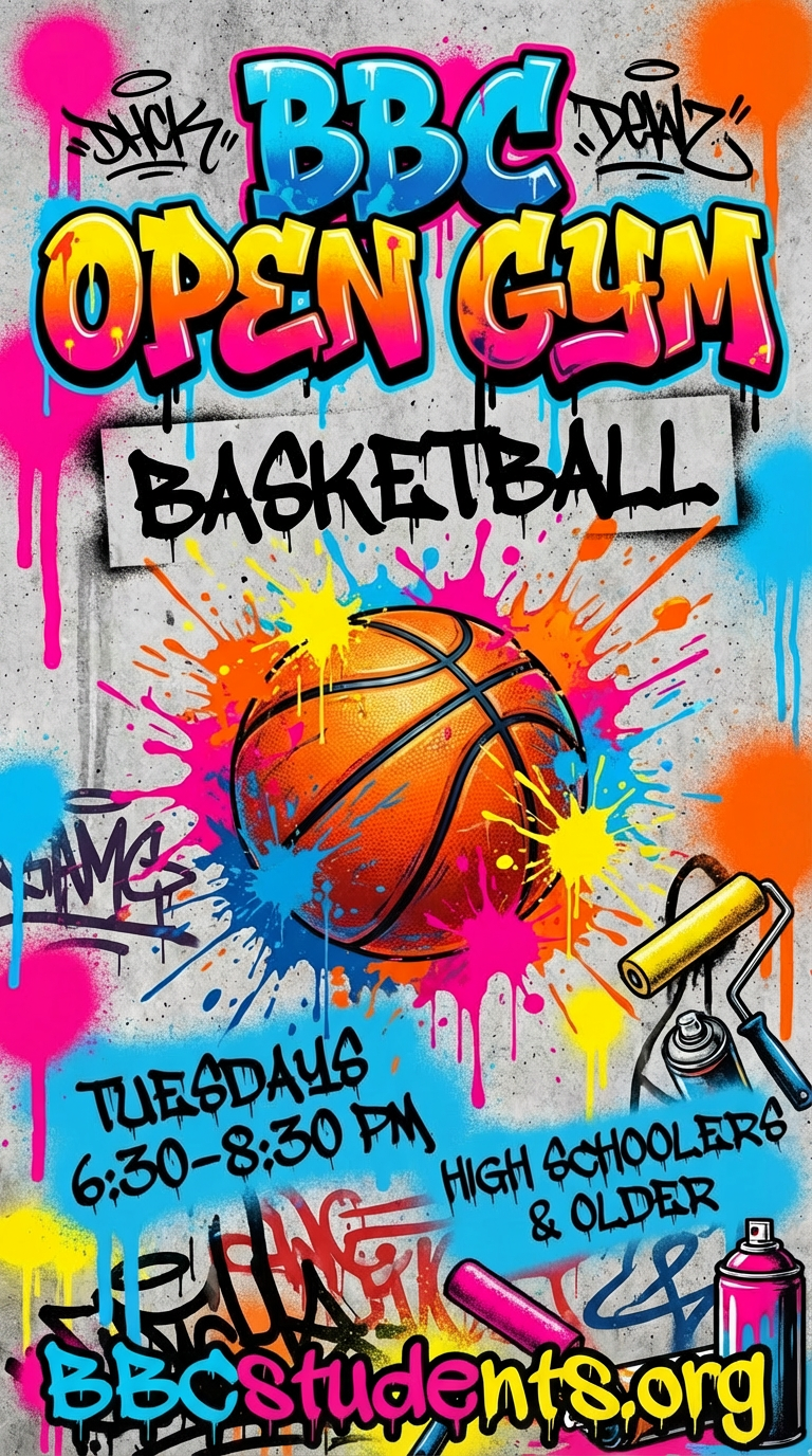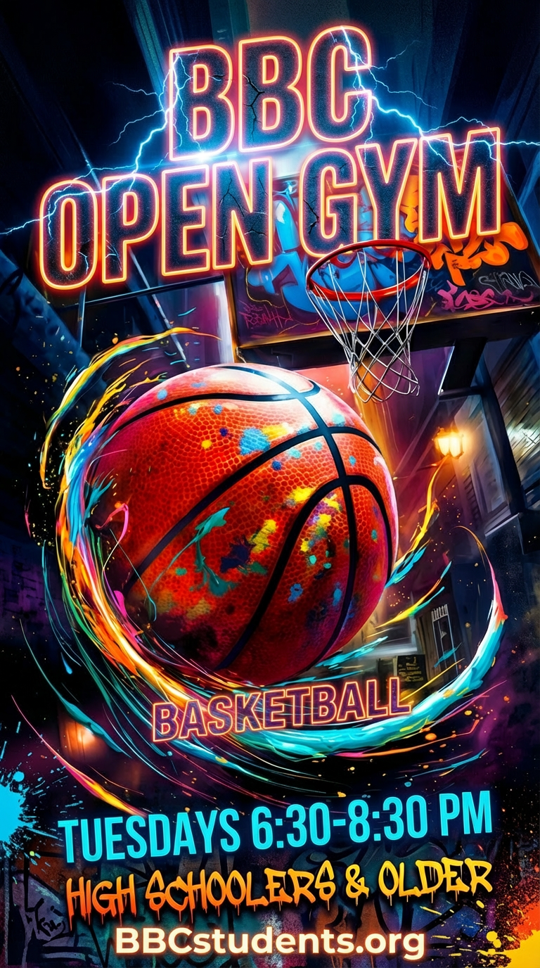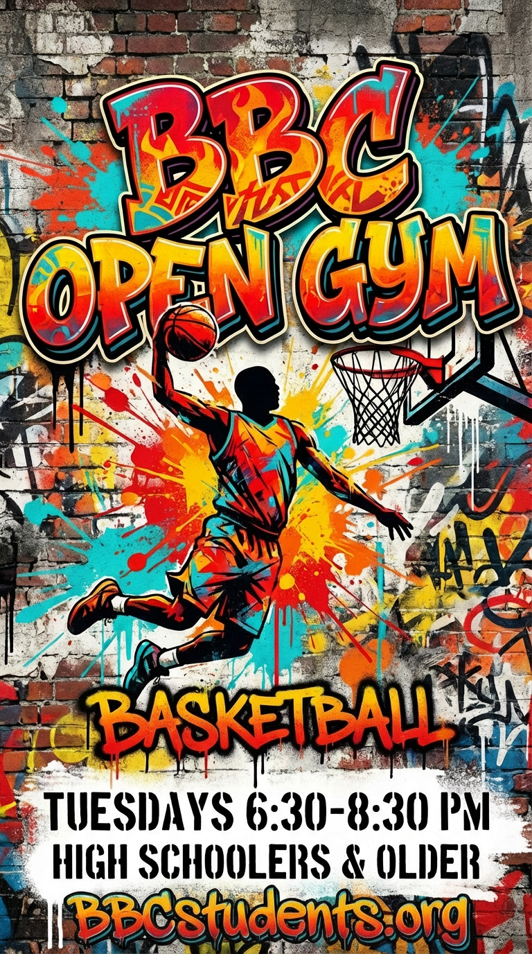 BBC is opening the gym for basketball every Tuesday night for high school students and adults, and you’re invited to hit the court with us starting this February! Whether you’re playing for fun, staying in shape, or sharpening your skills for the season, this is a great chance to run full-court games, connect with friends, and meet new people in a positive, encouraging environment.
